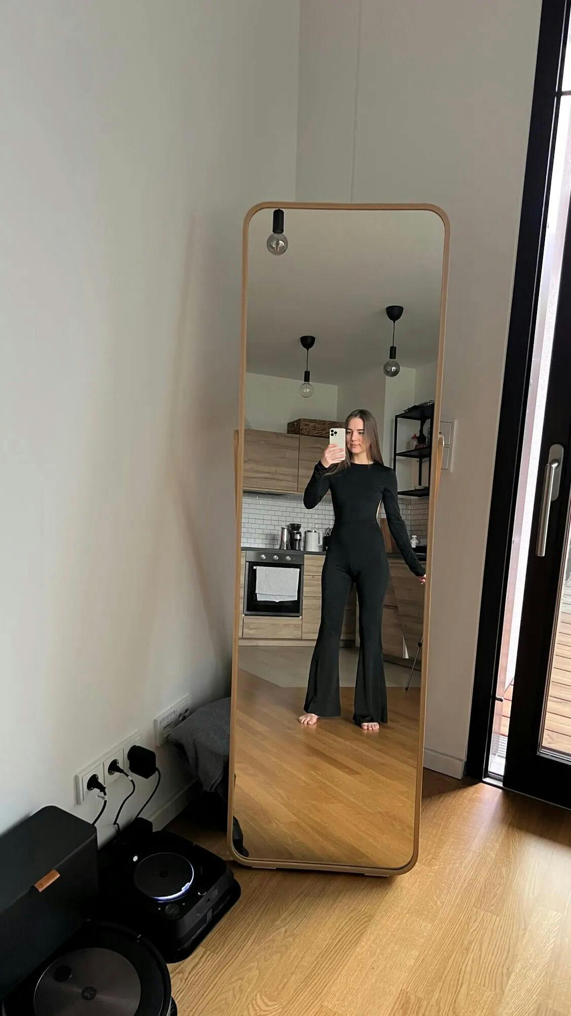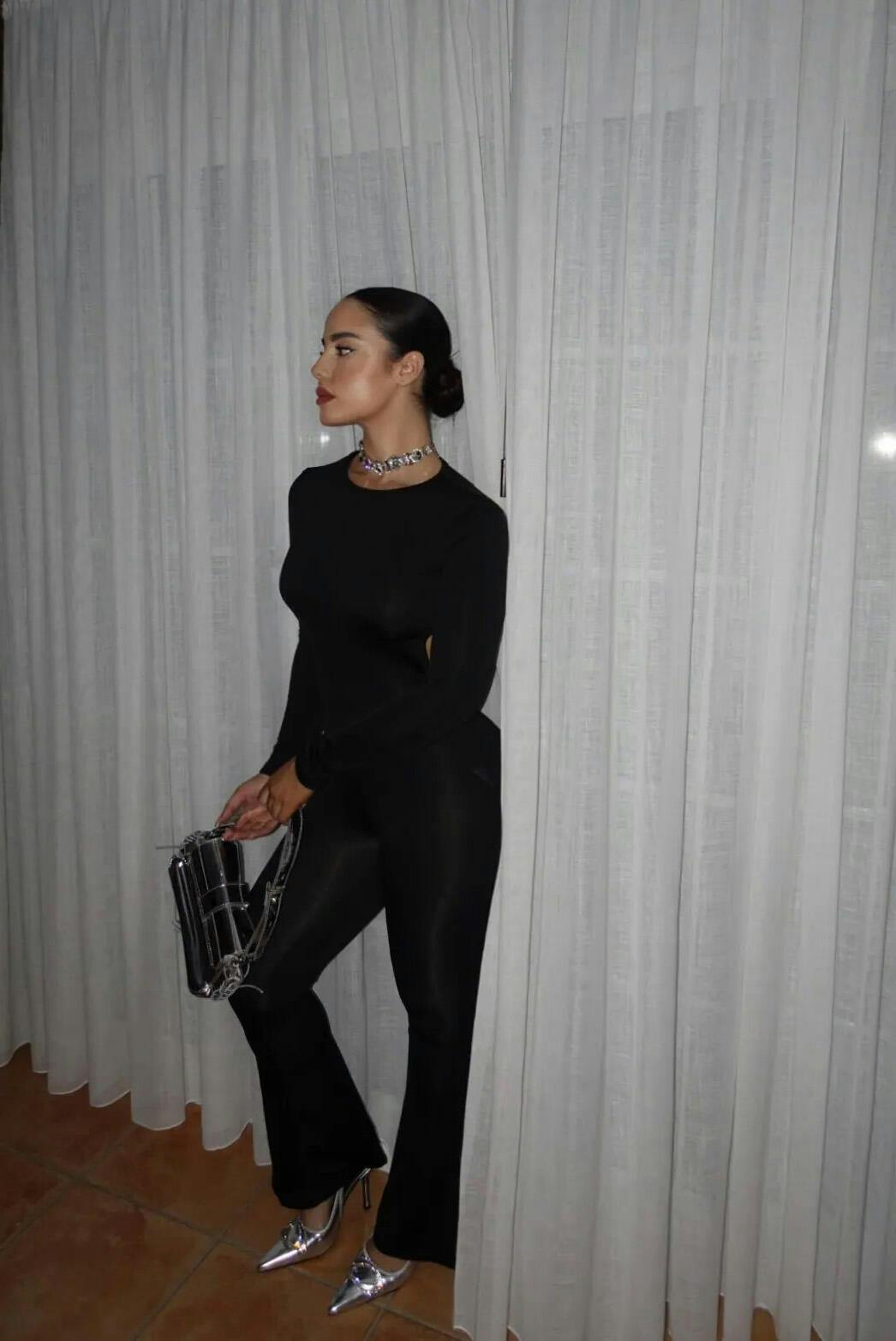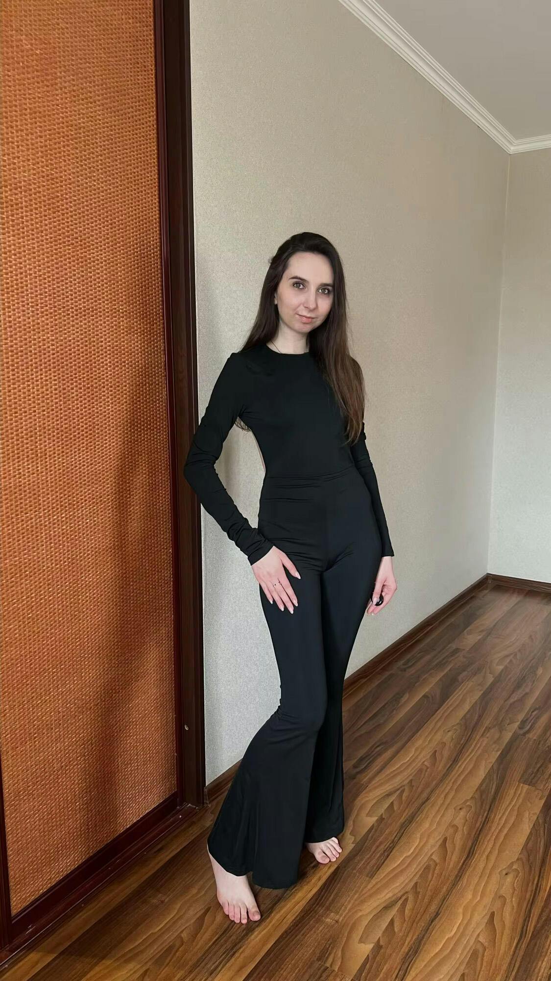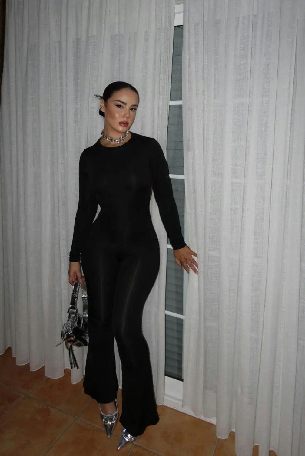 Get ready to turn heads in the Black Backless Jumpsuit! This chic piece features a low back that adds a daring touch, while the long sleeves and round neck keep it sleek. Made from stretchy fabric, it hugs your body with a skinny fit at the top, flowing into wide-leg flare pants.