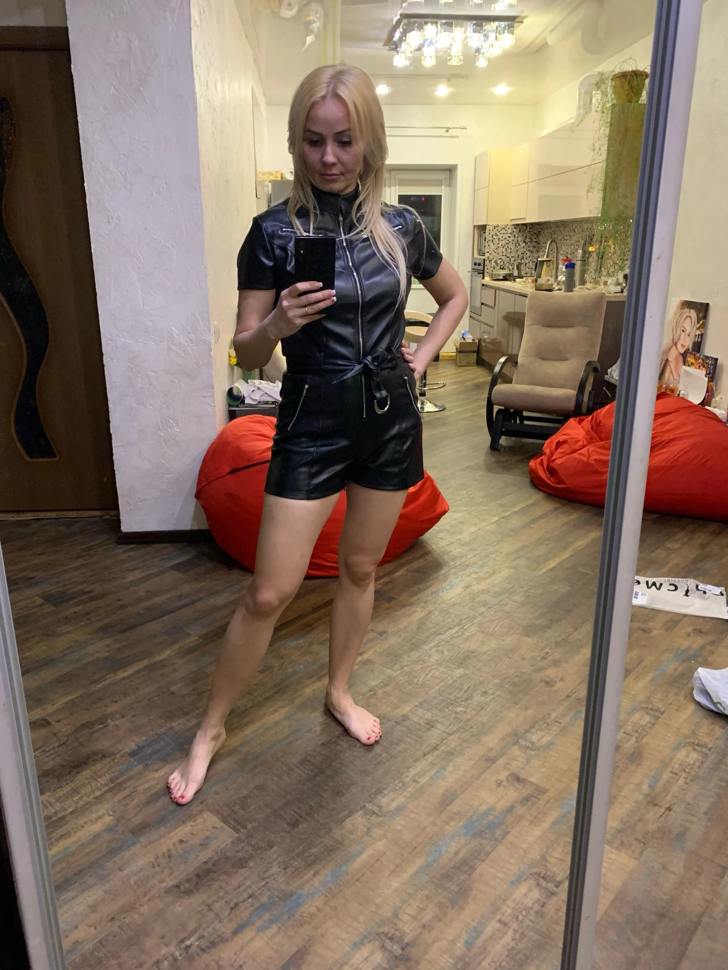 Make a bold statement tonight with this mouth-dropping romper in dark black, crafted from high-quality vegan leather with a seamless double fabric that feels nice on your skin. This leather playsuit has a short sleeve style and it features a high neckline with front full zipper closure and detailed with a nice four pockets with zipper closure, and to add some drama to this romper we've added a removable belt to wrap yourself and you an hourglass shape.