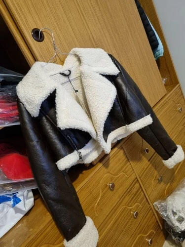 Inside, you'll find a luxurious beige shearling interior that not only provides unmatched warmth but also adds a plush texture to your ensemble. The cropped silhouette adds a trendy edge, making this jacket a versatile addition to your wardrobe.