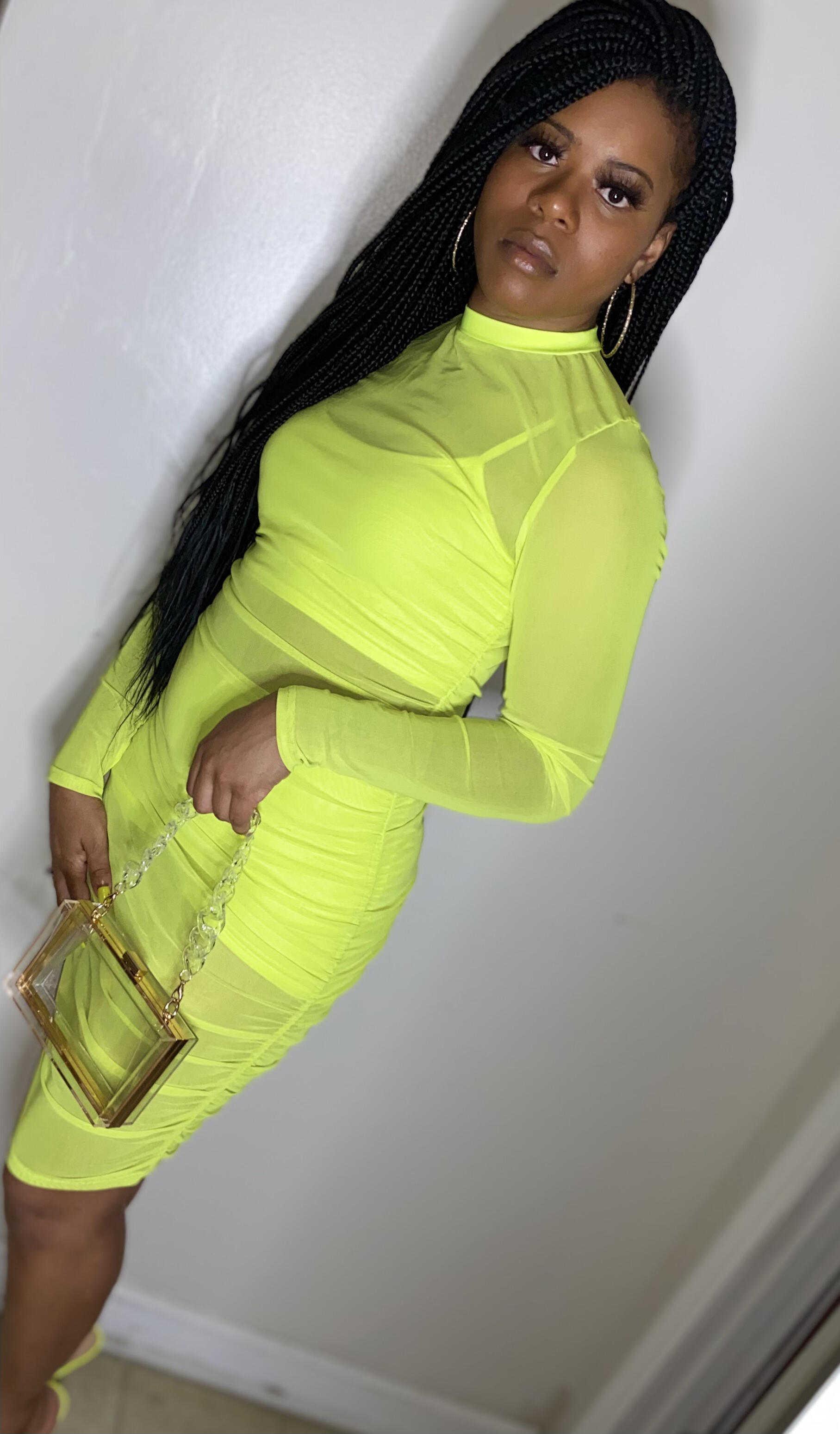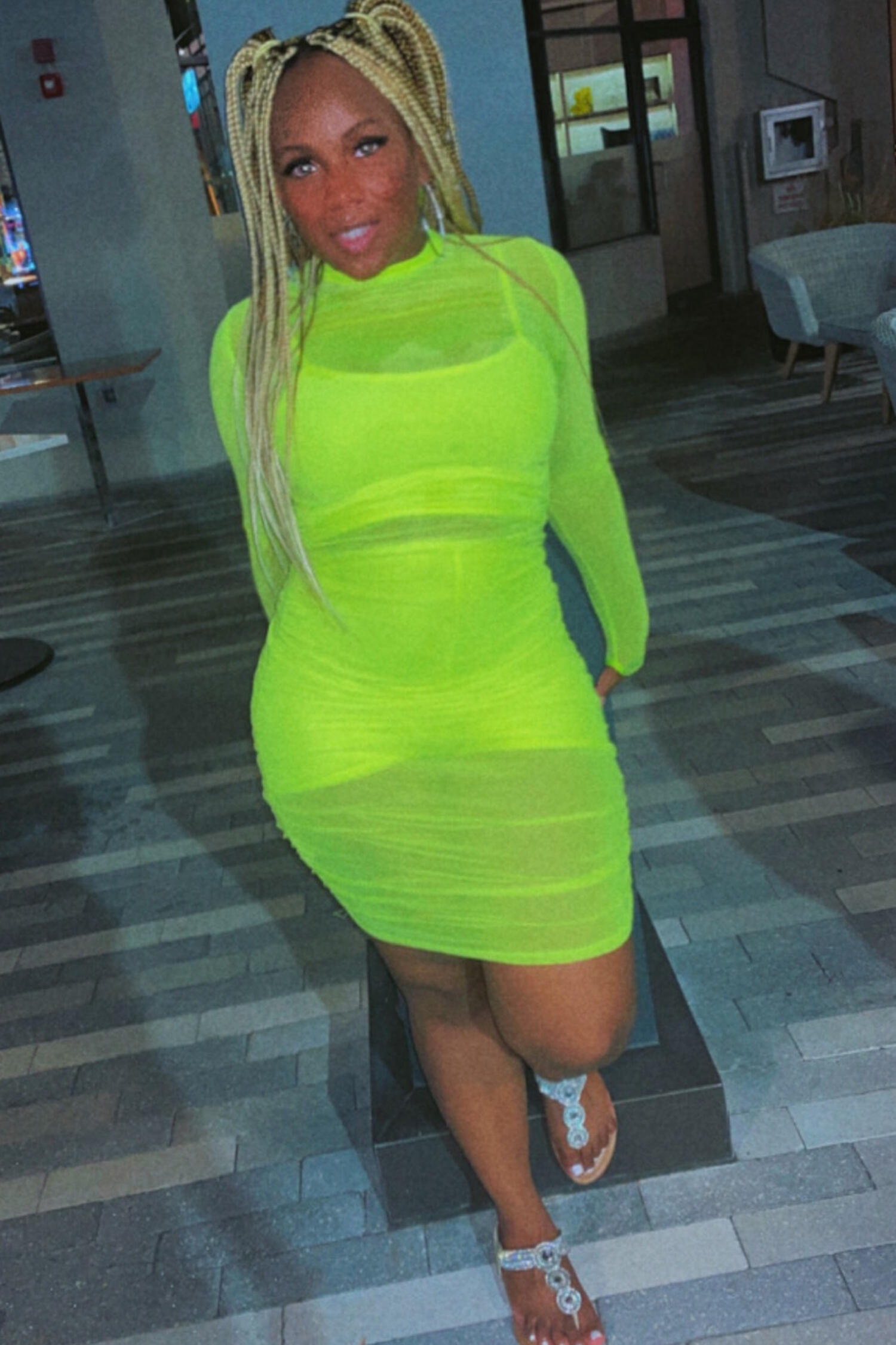 This Mesh Lime Green Dress is the perfect statement piece for any fashion-forward individual. The dress features a bold neon lime green color that is sure to turn heads. The mesh material adds a unique, see-through element to the dress while the ruched detailing adds texture and dimension. The dress has long sleeves that are designed with thumbholes, and a turtleneck collar for a sleek, modern look. The dress comes in a 3-piece set, including a crop tank top and high-waisted shorts, both in the same stretchy, bodycon material as the dress. The set is perfect for a night out or a special event, as it is sure to make you stand out in a crowd. The dress is made from stretchy material that will hug your curves in all the right places. Add this dress to your wardrobe for a bold, trendy look that is sure to impress.